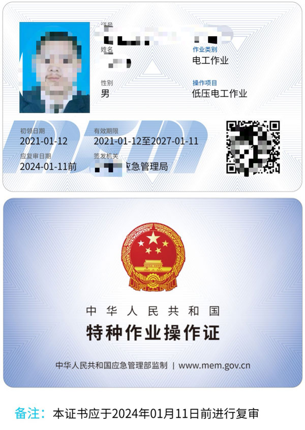 從2020年3月份起,高壓電工證書以新版的證書統(tǒng)一印制,分為電子證和實體證兩種類型,證書由相關(guān)部門頒發(fā),有效期是6年,每3年復(fù)審一次。