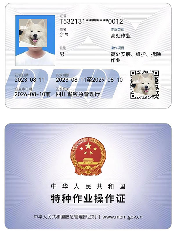應(yīng)急管理局《特種作業(yè)人員證書》低壓電工作業(yè),高壓電工作業(yè),熔化焊接與熱切割作業(yè),高處安裝維護拆除作業(yè) ,登高架設(shè)作業(yè), 制冷與空凋設(shè)備運行操作作業(yè), 制冷與空凋設(shè)備安裝修理作業(yè),特種從業(yè)人員上崗證是每3年一審!